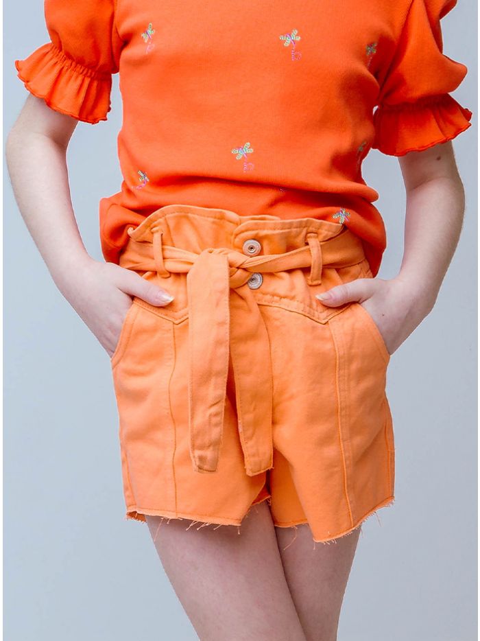 Possui cós larguinhs com faixa para amarração e recortes frontais pespontados.